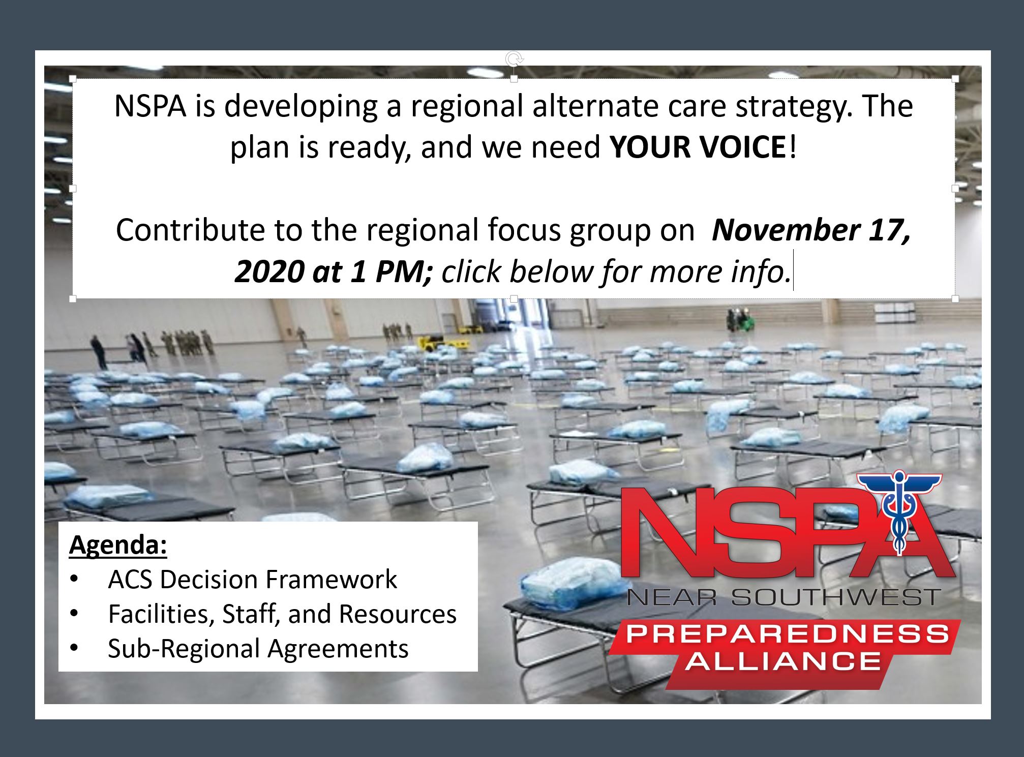 NSPA is developing a Regional Alternate Care Strategy and we need your voice. Join us on Tuesday, November 17th at 1:00 pm to discuss the plans as we pull apart